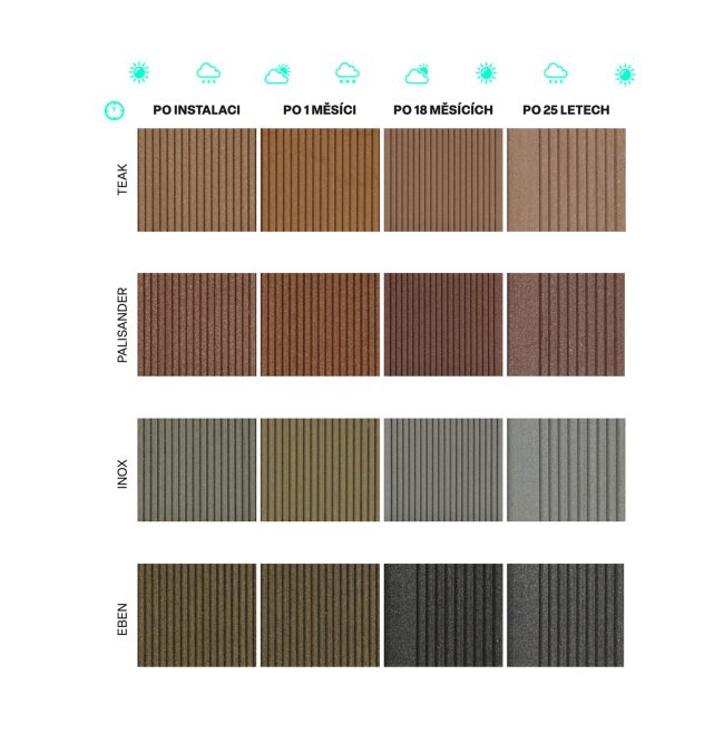 Přestože se jedná o malou část, je tou nejdůležitější, ale i nejdražší položkou, protože výrazně ovlivňují životnost a barevnou stálost kompozitu ve venkovním prostředí. Každá firma si chrání přesný poměr složek jako své know-how. Na aditivech se nedá ušetřit, protože by po krátkém čase začalo docházet k rozpadávání materiálu prken a znehodnocení celé investice.