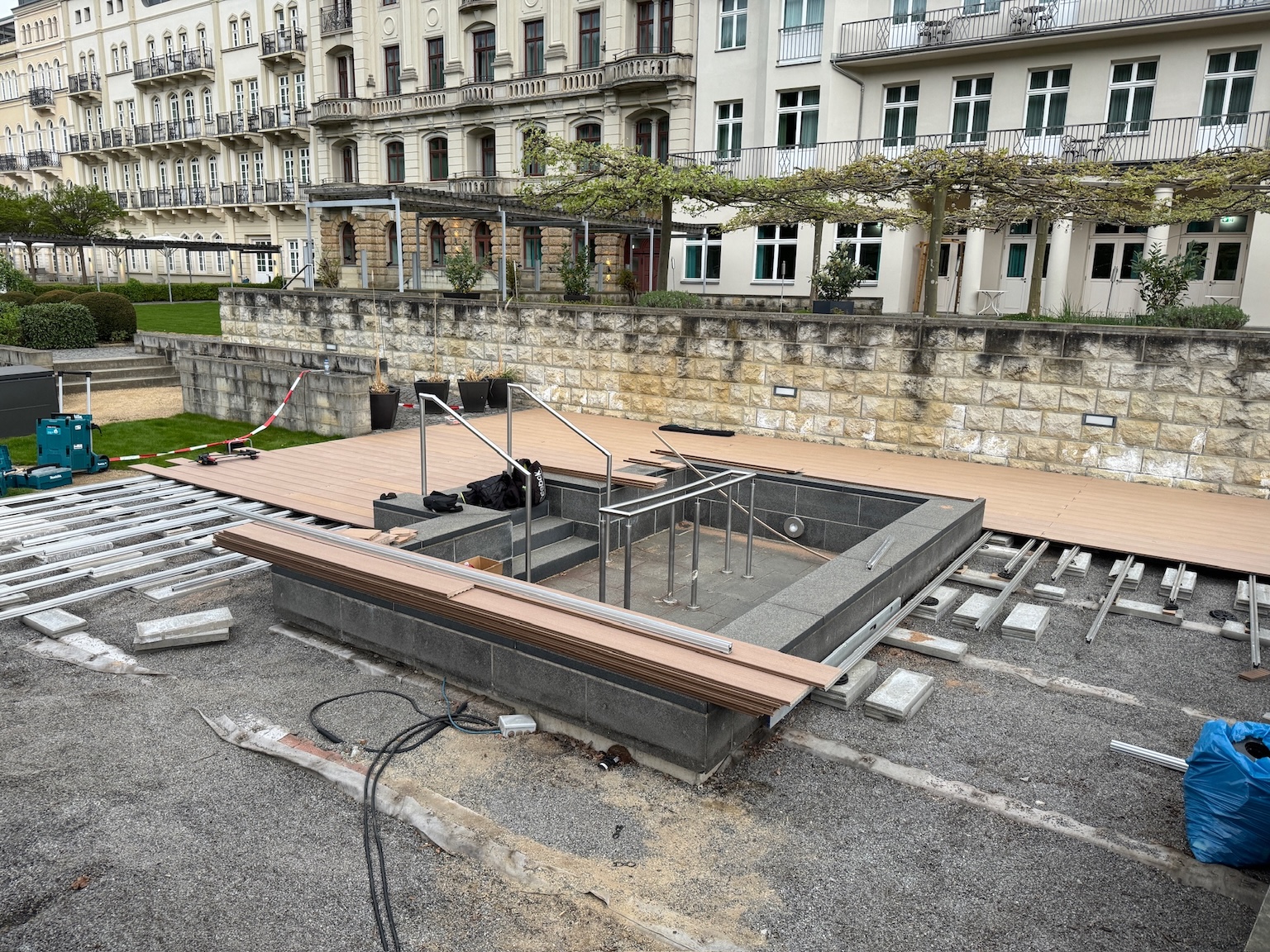 V hotelovém komplexu v lázeňském městečku Bad Schandau v Německu jsme nahradili starou, dožilou dřevěnou terasu, která již představovala bezpečnostní riziko, za nová prkna.